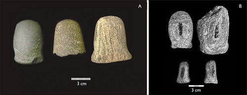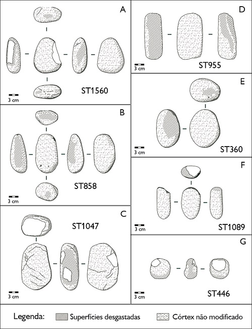 Some pebbles have displayed marks other than of impact, such as abrasion, grinding and polishing bands concentrated in the flanks, and related to the use as hand-polishers, probably in the finalization process of axes and handaxes. Many of these hand-polishers were simultaneously used as hammerstones and cores as well, and some of them even received transformative units, becoming a tool. This finding confirms the multiple uses of a single given volume to fill different roles in tool production, as well as their potential for adaptation that could be bonded with the requirement for the fulfillment of instantaneous activities.