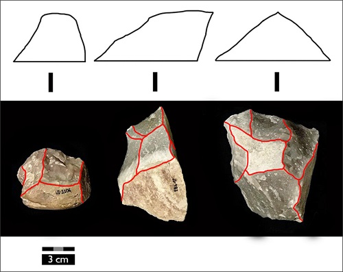 Unifacial shaped tools upon a flat surface: tools produced by shaping projecting volumes from a flat surface. They display convergent flake removals superimposing to each other. The transformative unit comes up with an abrupt penetration platform with inclined angles between 25 and 35 degrees (Figure 5).