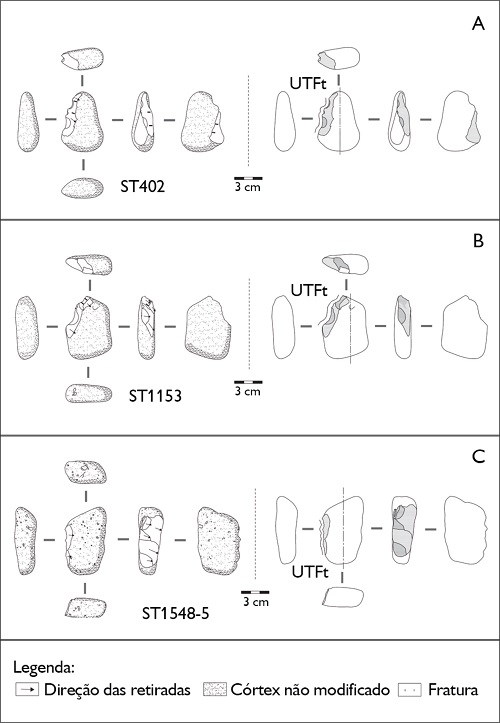 In the opportunistic strategy, the most common in Jericoacoara 1, the selection of volumes occurred mainly due to the occasional finding of certain technical characteristics that facilitate the unipolar and bipolar percussion upon support and shaping. As it has already been highlighted in other studies, the most sought-after volumes displayed corners and vertices forming angles of approximately 90 degrees and relatively plain faces, which were targeted as percussion surfaces (Boeda, 2014).