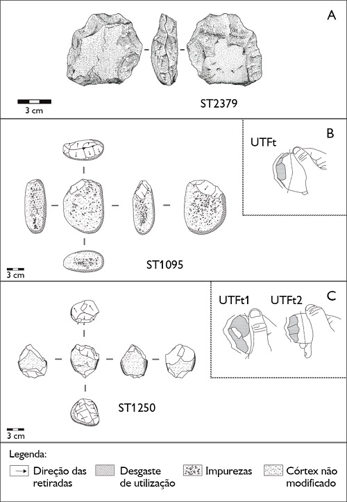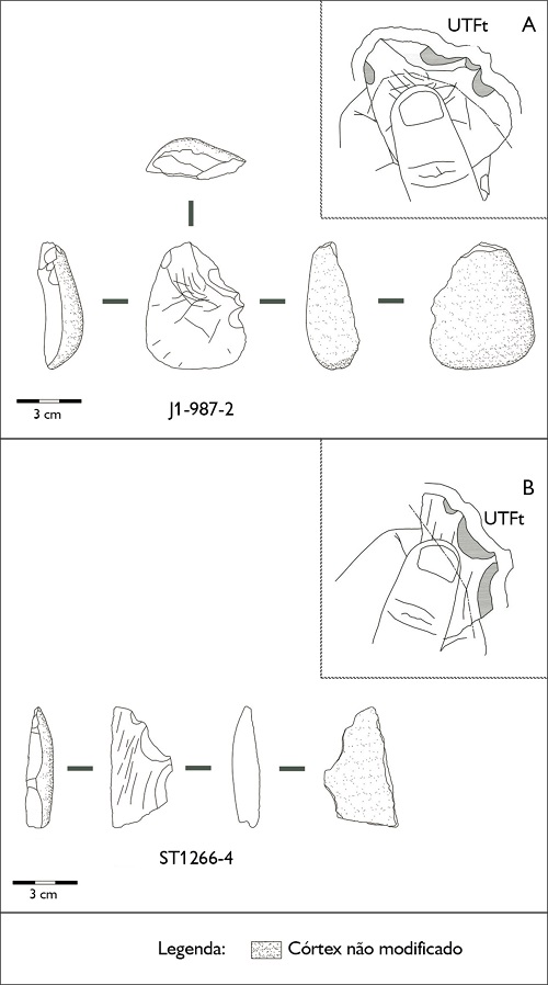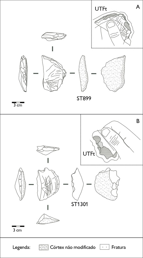 This study was based on the concepts, methods and techniques proposed by established approaches of lithic technology investigation (Inizan et al., 1995), along with some other procedures borrowed from the techno-functional approach (Lepot, 1993; Soriano, 2000; Lourdeau, 2006; Boeda, 2014; Lucas, 2014) that helped in the tools’ characterization. It is important to mention that this research does not intend to make a techno-functional analysis; it only takes important concepts from this approach in order to support the recognition of tools and to differentiate them from other categories.