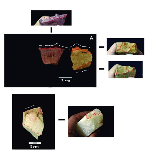 Bifacial shaping: a set of pebbles was submitted to this exploration mode in order to create transformative units forming double bevels. Some tools have shown more than one double bevel transformative unit in distal and proximal extremities of the volume. The absence of distinct patinas suggests that these transformative units were probably contemporary.