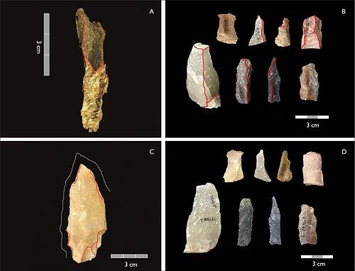 Flakes used directly as tools: a large number of flakes obtained through different percussion modes were directly used as tools by the artisans. This is the case of blades as well as a thermic lanceolate point, and the orange-bud bipolar flake. Some of these tools presented macroscopic use-wears (Figure 11). It is possible that C-type debitage managed the production of some of these tools, but the thinner flint blades probably resulted from laminar percussion.