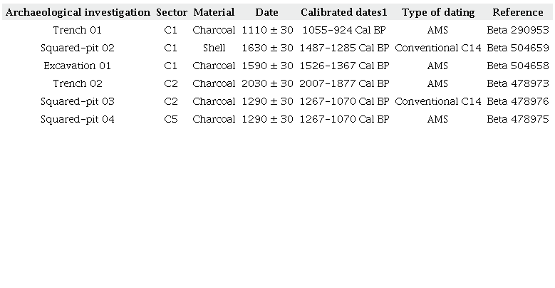 In 2010, archaeological research in Jericoacoara 1 focused on Concentration 1, where a squared pit and a trench were excavated. The objective was to identify archaeological materials for spatial and temporal contextualization. Ceramic fragments and lithic arte facts were identified at 110 cm below the surface level in Trench 1. A burnt pebble-structured bonfire pit was identified at the same level, a finding that allowed for the sampling of charcoal remains, which have been dated to 1055-924 Cal BP (1110 ± 30 BP - Beta 290953) (Figure 3) (V. Viana et al., 2016, p. 237).