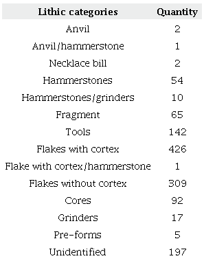 The shaping in the site resulted in the production of thin flakes that were wider than long, with no designated or proposed use in the production process. They are usually absent of hammering beads and bulbs, although vestiges of the latter can be found in some specimens. Another important feature is the presence of nervures and crests due to prior flake removal, which generated shallow and small negatives on the dorsal faces. However, some of the shaping flakes present cortexes accompanying the dorsal convexities. These observations indicate that the shaping process was carried out on at least four anatomically distinct types of volumes: 1) round and oblong pebbles; 2) angular pebbles and stones; 3) quadrangular and thicker support flakes without cortex; and 4) initial support flakes and splits.