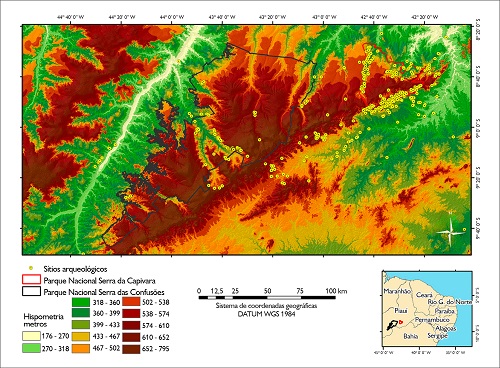 A Área Arqueológica Serra da Capivara compreende duas importantes unidades de conservação da biodiversidade nacional e sítios arqueológicos, o Parque Nacional Serra da Capivara e o Parque Nacional Serra das Confusões. Ambos estão localizados no sudeste do estado do Piauí, na região Nordeste do Brasil. O Parque Nacional Serra da Capivara ocupa área de 129.953 ha, compreendendo parte dos municípios de São Raimundo Nonato, Coronel José Dias, João Costa e Brejo do Piauí; e o Parque Nacional Serra das Confusões, com área de 823.843,08 ha, engloba os municípios de Canto do Buriti, Tamboril do Piauí, Jurema, Alvorada do Gurguéia, Bom Jesus, Guaribas e Cristino Castro (Figura 4).