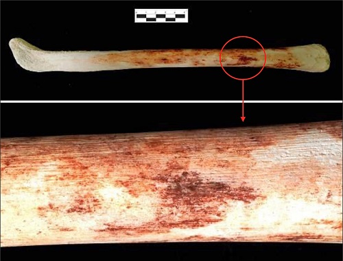 A aplicação direta também pode ser dada por polvilhamento do ocre em pó ou em tinta, espargido sobre os ossos. Essa ação confere pontos esparsos de manchas sobre o material ósseo. Essa situação foi observada nos sítios Toca do Mel e Toca do Capim (Figura 5).