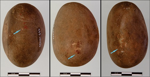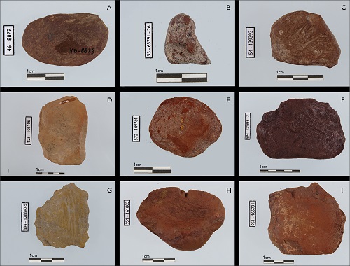 Foram evidenciados, em alguns contextos funerários da Área Arqueológica Serra da Capivara, ocres com marcas de utilização depositados junto aos enterramentos. Essa situação foi constatada nos enterramentos dos sítios Toca do Capim e Toca do Enoque. Esses materiais apresentam-se com desgastes e marcas de processamento, entre eles riscos profundos ou superficiais e subtração de massa, que demostram a extração de partes do mineral para o preparo do pigmento (Figura 9). Algumas das características que esses ocres apresentam é o fato de terem sido bem selecionados, serem homogêneos e sem incrustações, demonstrando a seleção prévia do material a ser utilizado.
