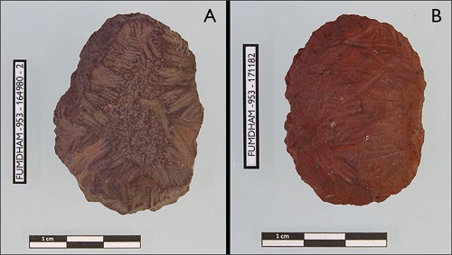 Contexto como esse pode, por exemplo, ser observado no sítio Toca da Baixa dos Caboclos, cujos ossos não apresentam marcas de ocre, aparecendo, no entanto, seixos com manchas de pigmento vermelho junto aos esqueletos na cova. A regularidade de pigmentos apresentada nos seixos sugere uma mancha provocada por manipulação antrópica e a intencionalidade de sua deposição no contexto funerário (Figura 7; Leite, 2011). Nos sítios Toca do Enoque e Toca do Alto do Capim, também são evidenciados seixos, conchas e trançados com manchas de ocre (Figura 8; Guidon et al., 2019).