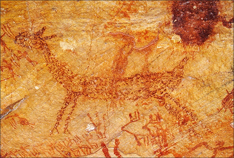 O grafismo obtido a partir do bastão sólido (seco ou umedecido) apresenta-se como um desenho riscado no paredão, utilizando-se do próprio bloco de matéria-prima (goethita/hematita) para a confecção do desenho, sem necessidade da preparação da tinta. Esse tipo de bastão é também descrito na literatura arqueológica como crayon, podendo ser utilizado a seco ou umedecido, para facilitar o manuseio (Cisneiros, 2008). Essa técnica aparece em poucos grafismos na Serra da Capivara, sobretudo em figuras de animais (Figura 11). Sua performance gráfica risca apenas os grãos mais proeminentes da superfície rochosa, deixando descontinuidades no traçado representado.