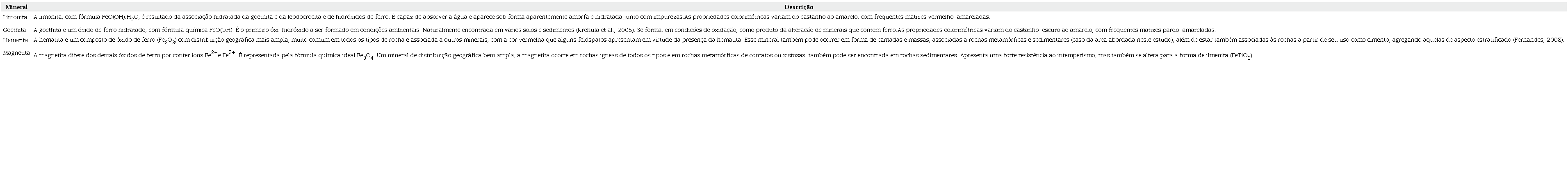O ferro, um dos componentes do ocre, é um mineral recorrente em muitas partes do globo, podendo se apresentar de diferentes formas e proporções em sua composição mineralógica (Figura 3). Esse mineral, com características de alta dureza, está presente em rochas ígneas, metamórficas, assim como nas rochas sedimentares e nos depósitos inconsolidados. Os óxidos também estão presentes nos mantos de intemperismo, podendo precipitar deles a partir de processos pedogênicos, criando níveis férricos e/ou crostas e carapaças com alto teor de óxido de ferro (Cornell & Schwertmann, 2003).