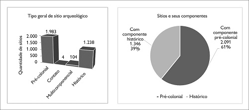 A partir desse ponto, já enfatizando somente sítios com componente pré-colonial, é importante ressaltar a classificação deles acompanhou a ficha de cadastro de sítios do IPHAN (instituída pela Portaria nº 241, de 1998, do IPHAN), dividindo, portanto, sítios pré-coloniais em sítios com somente vestígios pré-coloniais, sítios multicomponenciais e de contato.