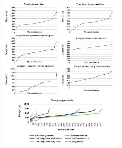 De fato, o gráfico de elevação dos sítios com grafismos rupestres (Figura 3) é o que representa a linha menos retilínea e mais gradualmente ascendente, o que significa pouca concentração de sítios em determinada elevação. Sua grande amplitude vai de aproximadamente 200-1.450 m.