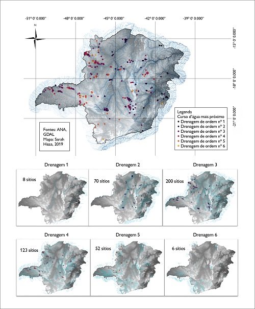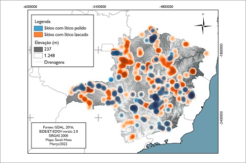 Um número maior de sítios líticos está circunscrito pelas bacias do rio São Francisco e, em segundo grau, dos rios Paranaíba, Jequitinhonha e Doce. Observou-se que, entre os 579 sítios líticos, 295 distam até 200 m em relação a alguma drenagem. A dispersão no território mineiro desses sítios a até 200 m de drenagens sugere também concentrações nas porções centro e noroeste do estado.