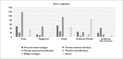 Soares (2013) estimou, com base em dados sobre 228 sítios com cerâmica Aratu-Sapucaí, localizados nos estados de Tocantins, Goiás, Bahia, Minas Gerais, Espírito Santo e Paraná, que esses localizavam-se muito predominantemente em áreas de tensão ecológica, considerando números absolutos. No entanto, no presente estudo (também se utilizando de números absolutos), foi observado que sítios com cerâmica Aratu-Sapucaí, em Minas Gerais, se encontram sobremaneira em áreas de floresta estacional semidecidual e em de áreas de tensão ecológica, com grande diferença quantitativa (Figura 7). Essa divergência de resultados pode derivar do fato de que os dados de Soares (2013) eram principalmente referentes a Goiás (127 sítios da amostra total de 228), contendo apenas seis sítios mineiros, o que poderá sugerir particularidades regionais.