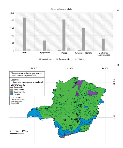 Os sítios com lítico polido, como vários outros tipos de sítios com componente pré-colonial, estão maioritariamente em área semiúmida (Figura 8A), o que não surpreende, por esta ser a de maior extensão no estado (Figura 8B), razão pela qual esse atributo não será explorado em detalhe.