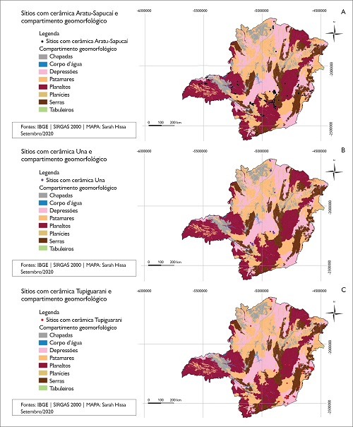Tanto sítios com cerâmica Tupiguarani quanto sítios com cerâmica Aratu-Sapucaí, em Minas Gerais, se encontram predominantemente em áreas de floresta estacional semidecidual. Sítios Tupiguarani são mais frequentes em depressões e patamares, em mais baixas elevações, entre cerca de 100-200 m e entre cerca de 600-800 m, enquanto sítios Aratu-Sapucaí estão mais em serras, em áreas de elevação mais alta, entre aproximadamente 800 e 1.000 m, mas ambos se localizam predominantemente em superfícies com forma/natureza geomorfológica de topos convexos.