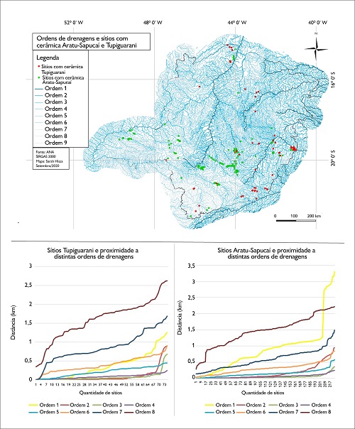 A maior parte dos sítios, tanto Tupiguarani quanto Aratu-Sapucaí, está a menos de 0,5 km em relação a cursos d’água de ordens 2, 3, 4 e 5. A maior diferença está na proximidade com drenagens que desembocam no oceano, ditas de nível 1, com sítios Tupiguarani mais próximos dessas do que os sítios Aratu-Sapucaí. Embora a amostra seja diminuta, observou-se concentração de cerâmicas Tupiguarani na direção sudeste do estado, associadas à bacia do rio Doce, condizente com o disposto em Corrêa (2014, p. 141).