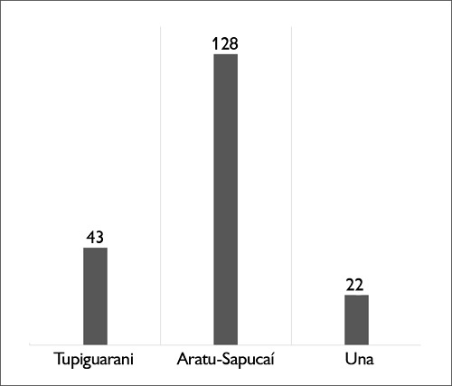 A partir do banco de dados, observou-se que eles estão especialmente implantados a céu aberto (84%) e não são tão numerosos quanto os sítios com cerâmica Aratu-Sapucaí, mas são mais frequentes do que os identificados como Una. Estão localizados predominantemente em depressões e patamares, seguidos de serras (Figura 11C), sobretudo em topos convexos. Os intervalos de elevação mais frequentes entre sítios com cerâmica Tupiguarani, representados por linhas mais horizontais no gráfico correspondente, estão entre cerca de 100-200 m e entre cerca de 600-800 m (Figura 4). Encontram-se, sobretudo, em áreas de floresta estacional semidecidual (Figura 7), mais associados a argissolos vermelhos e latossolos vermelho-amarelos. Sítios Tupiguarani são mais numerosos, respectivamente, nas bacias dos rios Doce, Paraíba do Sul e São Francisco e, dentre os 75 sítios, 37 distam até 200 m de alguma drenagem.