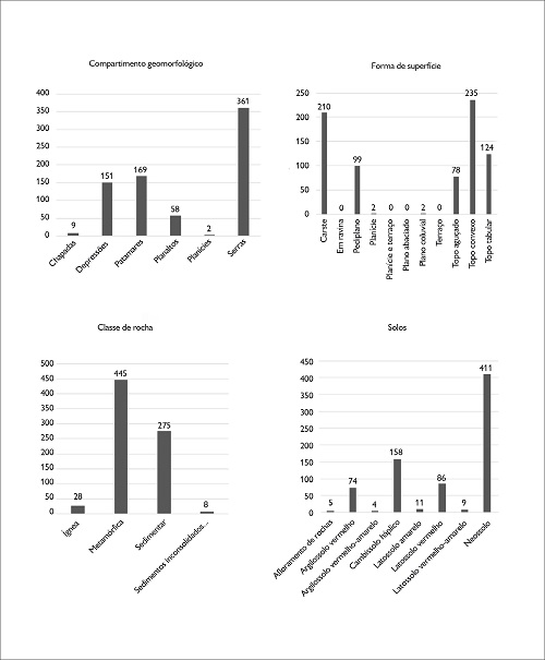Os sítios pré-coloniais com grafismos rupestres desse banco de dados estão mais frequentemente em áreas de cerrado, nas bacias dos rios São Francisco e Jequitinhonha, maiores bioma e bacias do estado. No que tange à classe de rocha, sítios com grafismos aparecem com mais recorrência em rochas metamórficas e sedimentares. Considerando compartimentos geomorfológicos, eles estão predominantemente situados em serras, seguidas de patamares e depressões. De acordo com as formas de superfície, são mais frequentes em topos aguçados e áreas de carste. Ainda, os grafismos são mais recorrentes em neossolos. Essas métricas não surpreendem, considerando a natureza de sítios rupestres (Figura 16).
