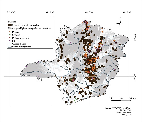 Nota-se predominância da identificação de sítios em determinadas regiões pesquisadas em projetos acadêmicos, como a região de Montalvânia, de Diamantina, da Serra do Cabral, do Peruaçu e de Lagoa Santa, e nas atividades de licenciamento no quadrilátero ferrífero em detrimento de outras áreas, ainda que haja concentrações de cavidades. Contudo, este estudo não inclui dados sobre cavidades pesquisadas e que não tinham grafismos (Figura 17). Nesse sentido, o registro negativo não significa ausência de grafismos. A isso se adiciona que, mesmo em cavidades pesquisadas onde não foi identificado grafismo algum, pode ter havido desenhos não preservados, talvez por terem sido produzidos com tintas perecíveis ou outras razões tafonômicas.