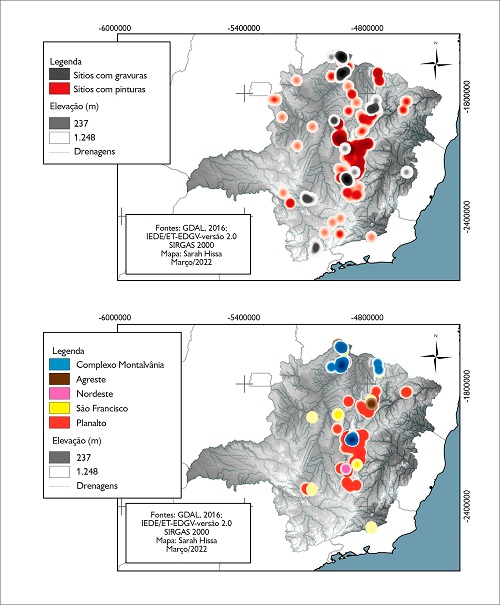 A Figura 18A evidencia maior quantidade de pinturas em comparação com gravuras e uma dispersão mais ampla de pinturas no território, alcançando algumas áreas onde não foram identificadas gravuras, especialmente nas mesorregiões de acordo com o IBGE: Noroeste, Norte de Minas, Jequitinhonha, Zona da Mata e Campo das Vertentes. Mais especificamente, essas áreas correspondem às sub-bacias dos rios Paracatu, Urucuia, Mosquito, Araçuaí, Santo Antônio, Piracicaba, das Mortes e Jacaré, dos afluentes do rio Verde Grande, afluentes mineiros do médio e baixo Jequitinhonha, afluentes mineiros do médio e alto Grande, afluentes mineiros dos rios Preto e Paraibuna.