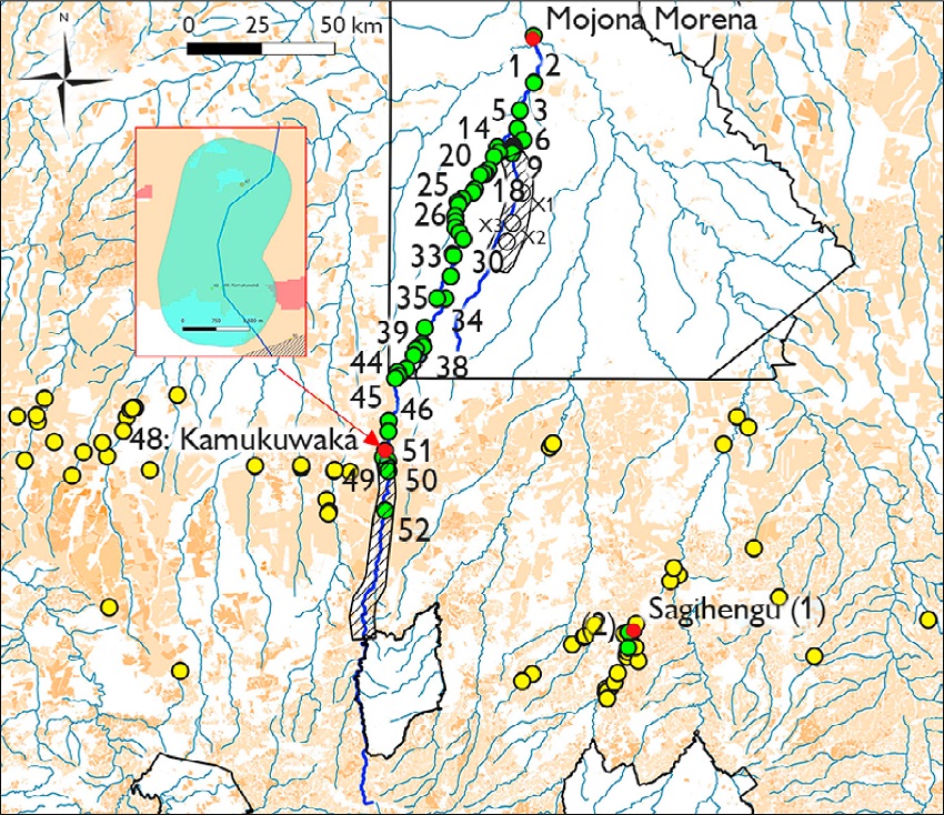 Os levantamentos efetuados deixam claro que, não obstante a densa conjunção de elementos etno-históricos no entorno da Gruta do Kamukuwaká, as práticas e histórias que lhes dão sentido extrapolam em muito a área atualmente tombada (Figura 1). A aldeia do herói constitui um ponto axial de onde radicam percursos rio acima – quando, por exemplo, Kamo, em perseguição de Kamukuwaká, transpõe a região de Teme Otopa (Figura 1; Quadro 2, n. 51) – e rio abaixo – quando os Kamukuwaká, descidos dos céus, rumam a Matowojo (Figura 1; Quadro 2, n. 1), fundando múltiplas aldeias pelo caminho. A montante da gruta, as corredeiras de Teme Otopa (Pedra da Anta) formam uma barreira pétrea no rio com cerca de 2 km de extensão. Anciãs(ões) Wauja contam ser aí a residência e o túmulo de duas antas ancestrais (hiperantas) mortas por Kamo, que, de sua queda e morte, se transformam em pedra, jazendo eternamente na forma de ilhotas no rio. Conta-se que, tal como em Kamukuwaká, aí habitam animais fantásticos e colossais – sucuris, macacos, porcos de água – que protegem o acesso à Casa da Anta, por isso nem canoa nem pessoa passam pelo rio, devendo-se contornar a pé todo o pedral.