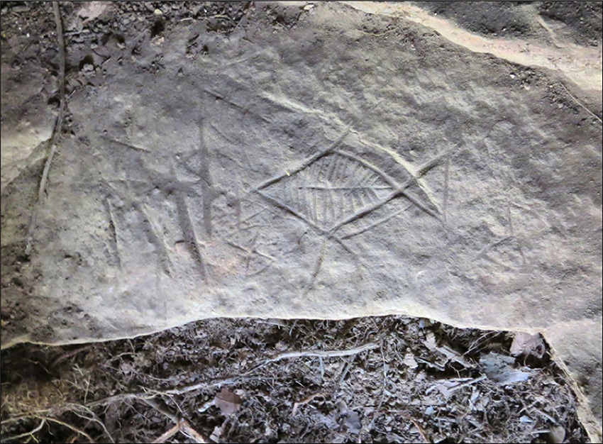 Antes de sua violenta depredação em 2018, um painel rupestre profusamente insculpido com gravuras adornava a face nordeste do abrigo (Figuras 3 e 4). A história explica que os jovens líderes em reclusão insculpiram motivos que colorem o quotidiano e trazem alegria aos alto-xinguanos, como kupato (peixe), kupato onapo (espinha de peixe), sapalaku (‘uluri’, o protetor pubiano feminino), tiñapu (vagina) e kulupiyene (que adornam a cesto-cobra tecida de música por Arakuni; Barcelos Neto, 2006, 2011). Os Wauja associam essas representações a grafismos corporais, de cerâmicas, de cestas que integram o repertório dos grafismos alto-xinguanos (K. Waurá, 2013; A. Waurá, 2018; Figuras 5 e 6).