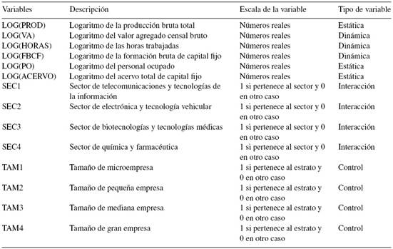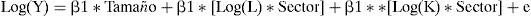 Donde "Log(Y)" representa el logaritmo de la producción, "Log(L)" representa el logaritmo del trabajo, "Log(K)" representa el logaritmo del capital, "Sector" es una variable dicotómica que representa el sector tecnológico, y "Tamaño" es una variable dicotómica que representa el tamaño de la empresa. Este modelo econométrico permitirá verificar si existen economías de escala debido a la siguiente condición: si (β2 + β3) es igual a uno se dice que existen economías de escala; si la condición es mayor a uno entonces existen economías crecientes de escala; cualquiera de los 2 resultados mostraría que existe una eficiencia relativa en el uso de los factores en los sectores tecnológicos.
