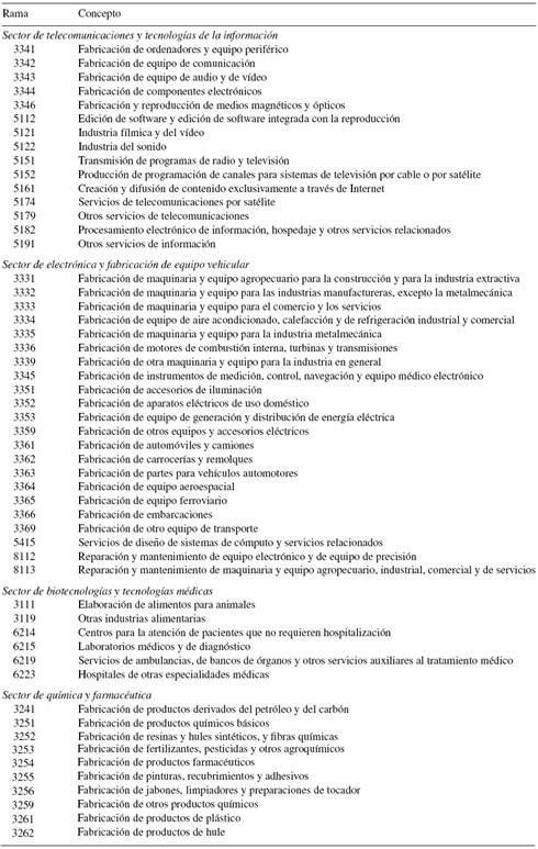 En la Tabla 1 se muestran las 22 actividades que se identifican dentro del SCIAN para estratificar el sector de electrónica y fabricación de equipo vehicular, dentro de la clasificación del SCIAN. Las subramas 3361 y 3363 tendrán un tratamiento especial, principalmente las empresas de tamaño grande, ya que se trata de las grandes armadoras automotrices del país, las cuales no contribuyen de manera significativa al sector de base tecnológica aquí descrito. Se muestran las 6 actividades que describen el sector de biotecnologías y tecnologías médicas dentro de la clasificación del SCIAN. Se detallan las 10 actividades que conforman el sector de química y farmacéutica.