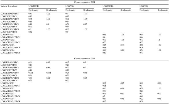 En la Tabla 10 se muestra un resumen de ambos modelos de regresión, en donde se evidencia que en prácticamente ninguno de los sectores para el año 2009 se tienen rendimientos crecientes de escala; de hecho, los rendimientos son decrecientes, en tanto que para el año 2004 los rendimientos fueron crecientes para prácticamente todos los sectores tecnológicos.