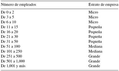 Las unidades que se tomarán en cuenta para la medición son empresas representativas para cada estrato de tamaño de empresa. De esta manera se puede acceder a las bases de datos a través de INEGI y los censos económicos, con clasificaciones por número de empleados, como se muestra en la Tabla 3.