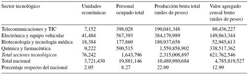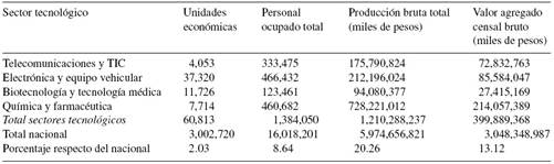A continuación, con el objetivo de entender el comportamiento y las pautas que ha seguido el sector de base tecnológica en México, se muestra la participación de los sectores tecnológicos a la economía nacional. En la Tabla 4 se observa que no es menor la contribución de las EBT al total de la producción bruta nacional en 2004. A pesar de ser solo el 2.03% del total de las empresas, estas generan el 20.26% de la producción bruta nacional, con el 8.64% del personal ocupado y generando un valor agregado del 13.12%.