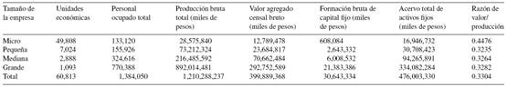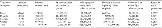 Hasta este punto, se puede observar que aunque se trata de alrededor del 2% del total de empresas, estas generan alrededor del 20% del total de la producción de industrias manufactureras del país. Sin embargo, a pesar de ser en su gran mayoría empresas de tamaño micro y pequeñas, las empresas que generan la mayor parte de la producción en sectores de base tecnológica son las empresas de tamaño grande. No obstante, es necesario señalar también que la razón de valor/producción muestra que la flexibilidad de la empresa micro y pequeña les ayuda a generar mayores volúmenes de valor agregado en relación con la mediana y gran empresa.