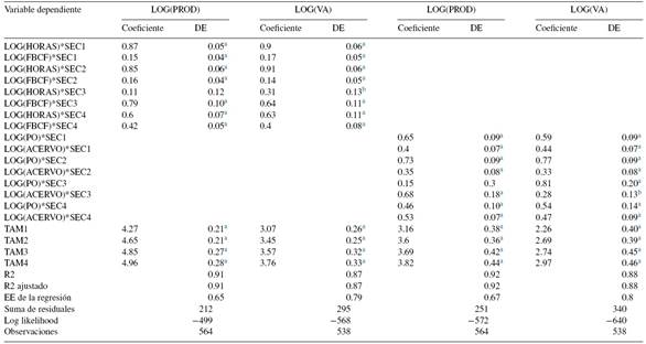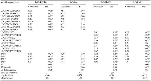 Se puede observar en la Tabla 8 que en la mayor parte de las regresiones existen rendimientos crecientes de escala. Por ejemplo, sumando los coeficientes LOG(HORAS)*SEC1 + LOG(FBCF)*SEC1 de la primera regresión (0.87 + 0.15 = 1.02) se observan rendimientos crecientes de escala, los cuales ya fueron contrastados con una prueba de Wald con resultados significativos. Esto implica que en el año del censo económico se puede decir que estos sectores trabajaron con rendimientos crecientes de escala, con excepción del sector 3 de biotecnologías y tecnología médica, ya que solo en una de las regresiones se encontraron rendimientos crecientes. Por otra parte, en todas las regresiones se estima que el nivel tecnológico con el que parten las empresas de tamaño grande es mayor que el del resto de los estratos de tamaño. Incluso, se puede decir que el tamaño de la empresa importa, ya que a mayor tamaño de la empresa se tiene un nivel tecnológico mayor.