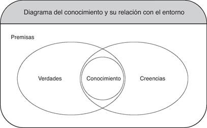 En la Figura 1 se ilustra la forma en que, partiendo de ciertas premisas que son sujetas tanto a la creencia como a las verdades que se consideran ciertas, se logra llegar a la creación de "conocimiento". Este, definitivamente, está sujeto al contexto que lo condiciona a ser parte de lo que se manifiesta como posible. Cada autor, investigador, "observador" o sociedad tienen en común antecedentes históricos, filosóficos y cosmogónicos que definen todo lo creíble y lo considerado verdadero (Michel, 2006).