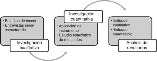 La investigación se realiza sobre un sector estratégico en la economía nacional (Delgado y Garibotti, 2005), y la importancia radica en la factibilidad que tiene este sector para ayudar al crecimiento de regiones e inclusive naciones mediante la promoción de la tecnología como parte de los lineamientos de una política de desarrollo (Carrillo, Hualde y Villavicencio, 2012). El estudio de las empresas del sector de tecnologías de información desde perspectivas basadas en su valor intangible se sustenta en la gestión del conocimiento (Marsal y Molina, 2002). Para efectos de obtener resultados válidos, se ha recurrido a una estrategia de investigación mixta, esto es, se utilizan técnicas cualitativas y cuantitativas para encontrar resultados congruentes al proceso indagatorio (Fig. 10).