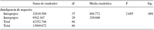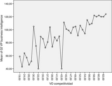 Observaciones. Se observa una relación directa positiva presente entre la competitividad y su variable predictora, inteligencia de negocios . Se concluye que tales acciones de fortalecimiento deben seguir y mejorar en lo posible (Fig. 12). Los resultados del análisis de varianza indican que la variable predictora tienen un efecto significante en la competitividad . En el caso de inteligencia de negocios , donde F(37, 29) = 2.695 y p = 0.004, las media general de 90.4925 presenta una tendencia hacia el incremento de la competitividad en relación ainteligencia de negocios .