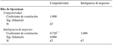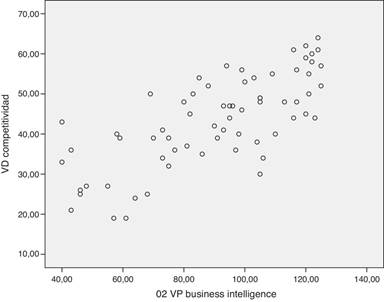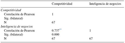 En la Tabla 9 se observa una alta correlación entre competitividad y Business Intelligence (r = 0.737 y p < 0.001). Esta interpretación no implica causalidad ; la relación significante solamente implica que las variables covarían entre ellas si existe relación entre las variables predictoras y la variable dependiente mayor a 0.500 y con un nivel de significación menor a 0.01.
