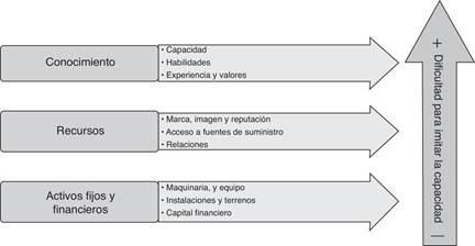 El conocimiento es la estrategia con mayor dificultad de imitación. Aquellas tácticas que se sustenten en replicar los elementos respaldados en estrategias sobre activos fijos y financieros -tales como maquinaria y equipo, instalaciones y terrenos, así como capital financiero-, o de la misma manera las que busquen generar recursos similares a la competencia -como por ejemplo la generación de marca, imagen y reputación, acceso a fuentes de suministro y las relaciones comerciales-, son relativamente más sencillas de replicar y de esta manera eliminar la ventaja competitiva (Tiwana, 2002).