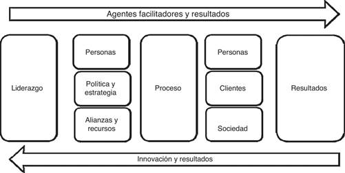 El modelo Fundación Europea para la Administración de Calidad (EFQM) es uno de los modelos empresariales que se utilizan en Europa de forma común. En la versión Excelencia 2000 (EFQM, 2010) hace mención de la importancia del conocimiento, la innovación y los procesos de aprendizaje para llegar a la excelencia empresarial. Este modelo tiene como objetivo ofrecer a las empresas una metodología que las lleve al mejoramiento de sus estrategias para el logro de resultados organizacionales (Fig. 4).