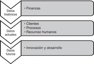 El modelo incluye el análisis de las finanzas como parte de los resultados de acciones pasadas tomadas en la empresa en relación a la creación de valor; los clientes, los recursos humanos y los procesos como parte de los datos actuales, para finalizar con las acciones de renovación y desarrollo como efectos en el futuro de la empresa. Estas secciones se indican en la Figura 8.