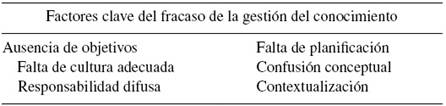 Aunque los factores que, en función del contexto particular, pueden determinar el éxito de un proceso de gestión del conocimiento son muchos y variados, en la Tabla 2 se enumeran los definidos que provocan el fracaso de un proyecto de gestión del conocimiento.