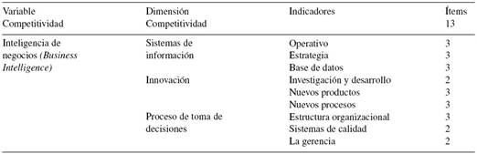 La variable predictiva o dependiente "competitividad" se dimensiona en una categoría y la variable predictora o independiente "Business Intelligence" se dimensiona en 3 categorías; estas a su vez se derivan en 3 indicadores, y a cada indicador se le desarrollaron 3 ítems o preguntas.