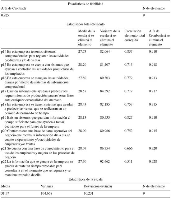 El resultado de 0.925 nos indica alta consistencia interna entre los ítems de sistemas de información ; se detecta que el ítem p36 muestra un incremento a 0.928 en el nivel de confiabilidad, pero se considera que no es relevante el cambio, por lo que el cuestionario queda de la misma forma.