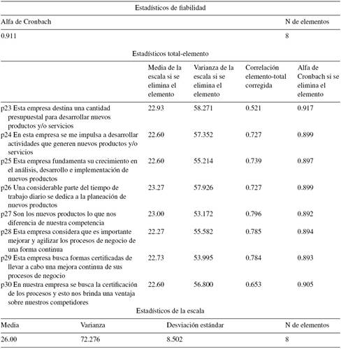 El resultado de 0.911 nos indica alta consistencia interna entre los ítems de innovación ; se detecta que el ítem p37 muestra un incremento a 0.917 en el nivel de confiabilidad, pero se considera que no es relevante el cambio, por lo que el cuestionario queda de la misma forma.