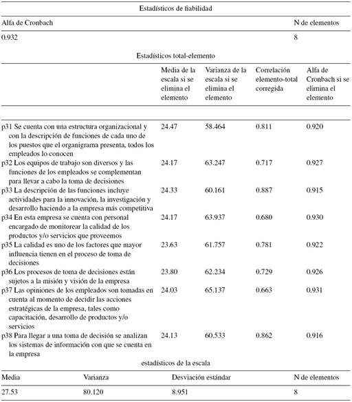 El resultado de 0.932 nos indica alta consistencia interna entre los ítems de proceso de toma de decisiones ; esta es la confiabilidad más alta que presenta el análisis, por lo que el cuestionario queda de la misma forma.