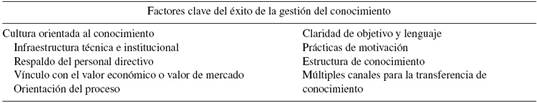 Aunque los factores que, en función del contexto particular, pueden determinar el éxito de un proceso de gestión del conocimiento son muchos y variados, en la Tabla 1 se enumeran los definidos para lograr el éxito de un proyecto de gestión del conocimiento.