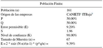 En cuanto al universo objeto de estudio, y tras analizar las características del sector de tecnologías de información en la ciudad de Tijuana, B.C., se decide que formen parte del análisis todas las empresas reportadas por el estudio realizado por PRODUCEN en 2007 y 2008 (PRODUCEN, 2008), así que se buscan datos de las empresas en el Clúster de Tecnologías de Información de Baja California, A.C. (ITBaja) y también en la Cámara Nacional de la Industria de la Electrónica, las Telecomunicaciones y la Informática (CANIETI).