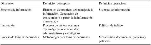 Estas definiciones se consideran adecuadas debido al análisis empírico del entorno de negocios dinámicos en los que se encuentran inmersas las compañías de base tecnológica y pertenecientes al sector de tecnologías de información y comunicación. En este sentido, la variable inteligencia de negocios (Business Intelligence) se subdivide en 3 dimensiones: sistemas de información, innovación y proceso de toma de decisiones.