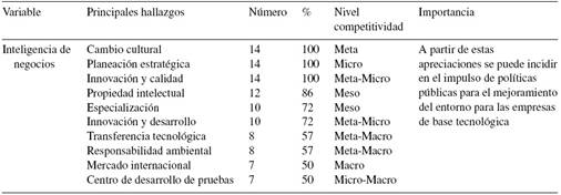 Las variables de estudio forman parte del constructo social en el cual se ubican las empresas de Tecnologías de Información (TI). Los procesos de inteligencia de negocios intervienen directamente en la apreciación que se tiene de la competitividad en las organizaciones. Áreas de oportunidad que siempre están una continua mejoría son la vinculación, la transferencia tecnológica y la especialización del capital humano por medio de procesos educativos certificados que mejoren las opciones de generar valor y propiedad intelectual para las organizaciones.